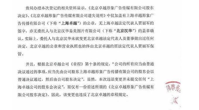记者获得了一份北京卓越形象的诉讼材料称:2018年12月,视觉中国全资子公司北京汉华捏造了北京卓越形象广告的股东决议,并谎称子公司的营业执照和公章遗失,最后将子公司的法定代表人进行更改。
